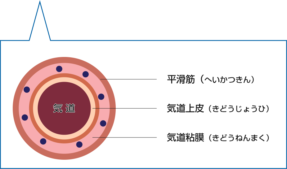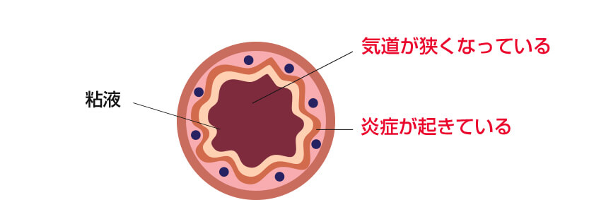 炎症がある気道に刺激が加わると、気道が狭くなり痰などの分泌物が増えます。