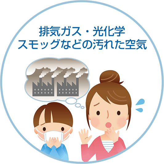 日常生活のちょっとした刺激が引き金となって、喘息の発作を起こすことがあります。例えばタバコの煙、排気ガス、工場の排煙などで汚染された空気などです。最近は、中国大陸由来のpm2.5の濃度が上昇することも原因の一部です。なかでもタバコは一酸化炭素やニコチンをはじめ、200種類以上もの有害物質が含まれているため、気道の粘膜の炎症を促進させ、喫煙する人はもちろん周囲でその煙を吸う人も喘息の発作を引き起こしやすくします。
