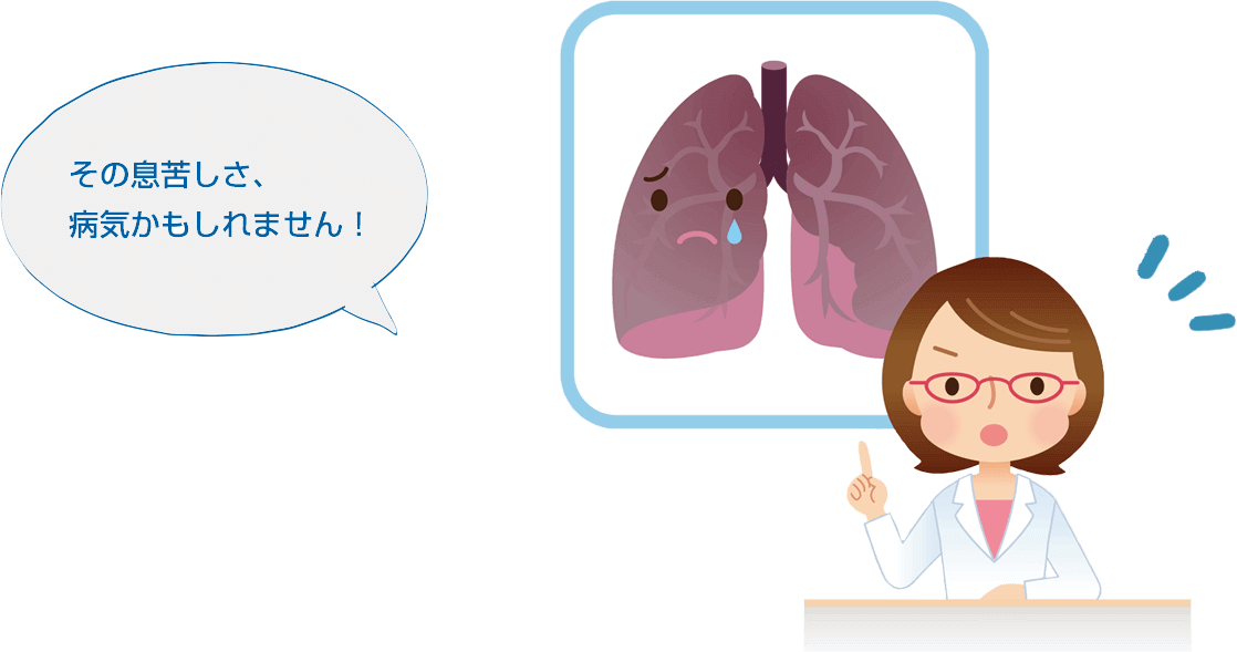 慢性の咳、痰、息切れが代表的な症状であり、初期では症状が軽く自分でも意識されないことがあります。